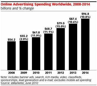 – Unlike spending on all other major media, online advertising spending increased, growing 2% to $55.2 billion. This year brought a return to double-digit growth, with online ad spending set to reach $61.8 billion worldwide in 2010.
