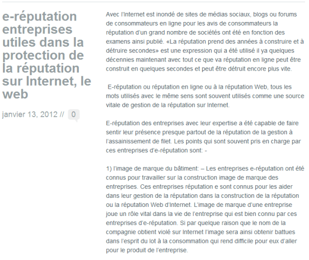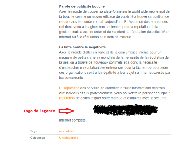 – améliorer votre e-réputation, e réputation, e-reputation, e reputation, la marque personnelle avec la veille technologique, community management sur le contenu en ligne sur Internet. => autre exemple de commentaire visant seulement à répéter des mots clés en relation avec l’activité de l’agence concernée. Petite précision, le nom de l’agence figurait également parmi ces mots clés !