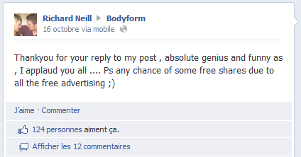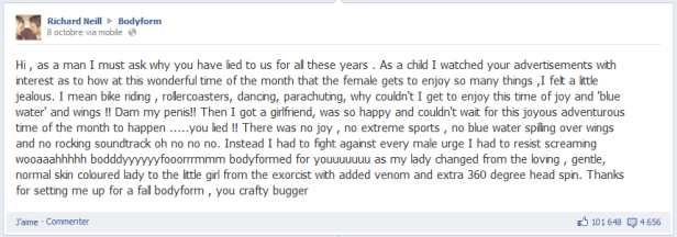 Ce n’est pas tant le Post lui-même de l’internaute sur la page Facebook de Bodyform, dont le ton est à l’évidence humoristique, que le nombre de réactions consécutives à ce post : + de 101000 Likes et + de 4600 commentaires !
