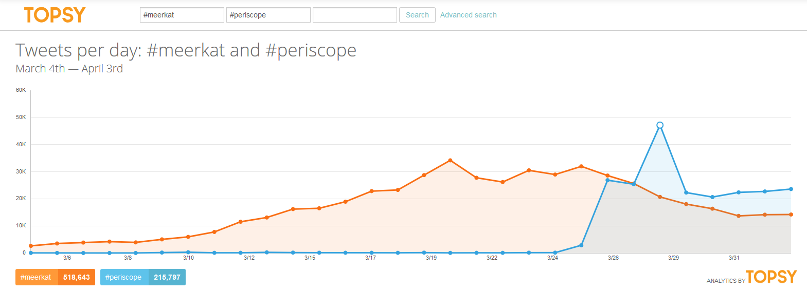 Le nombre de tweets mentionnant l’une ou l’autre application sur Twitter montre la chute de Meerkat depuis le 26 mars, date de lancement de Periscope.