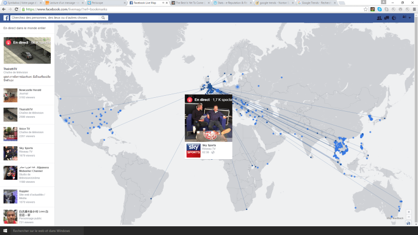 La Carte proposée par Facebook est intéressante puisque juste en positionnant son curseur sur un point, la vidéo apparait en miniature et indique le nombre de personnes en train de la visionner.