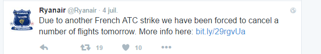 Etait-ce une tentative de message humoristique ou plutôt l’occasion de critiquer la France et les problèmes occasionnés par les grèves pour Ryanair? On peut se poser la question à la lecture de précédents tweets de la Compagnie.