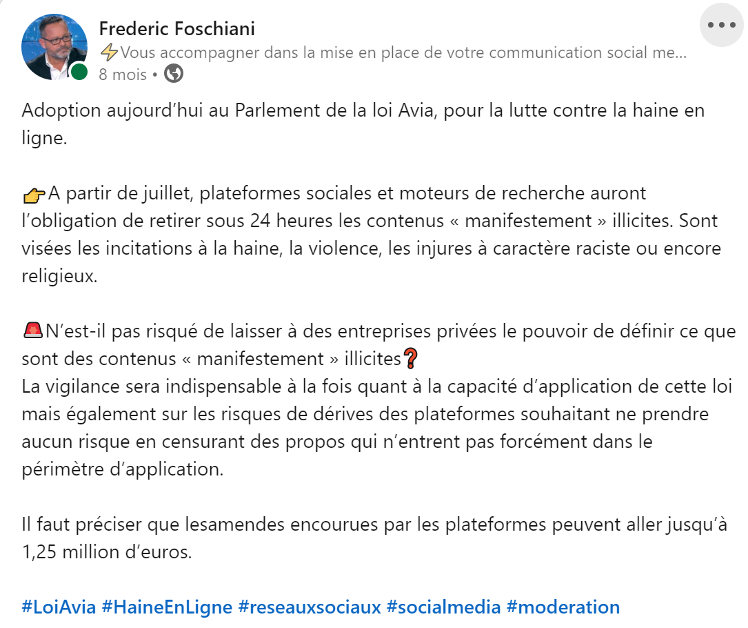 Il y a quelques mois, lors du passage de la loi Avia à l’Assemblée, visant à lutter contre la haine en ligne, j’avais exprimé mes doutes quant aux risques de cette loi contraignant les plateformes à retirer sous 24 heures les contenus « manifestement » illicites.