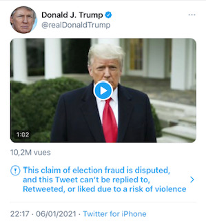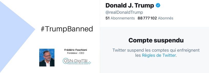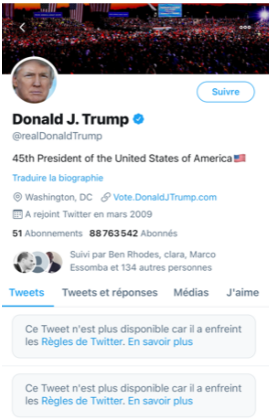 A la suite des violences et l’envahissement du Capitole par des Pro-Trump, Twitter et d’autres réseaux sociaux ont supprimé plusieurs contenus diffusés sur les profils de Donald Trump. La répétition de propos contraires aux CGU des plateformes a finalement abouti à la fermeture de certains de ses comptes dont son profil Twitter dont il avait fait son outil de communication privilégié auprès de ses partisans.