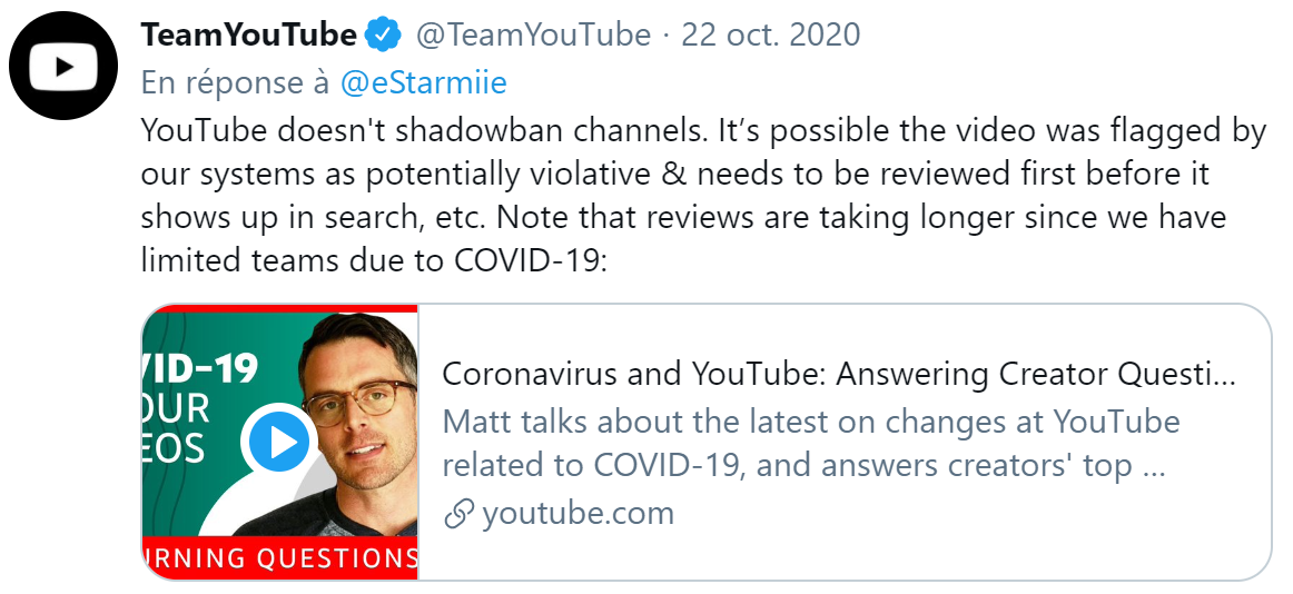 « YouTube ne fait pas de shadowban. Il est possible que la vidéo ait été signalée par nos systèmes comme potentiellement violente et qu’elle doive être examinée avant de faire l’objet d’une recherche, etc. Notez que les examens prennent plus de temps car nous avons des équipes limitées en raison de COVID-19 »