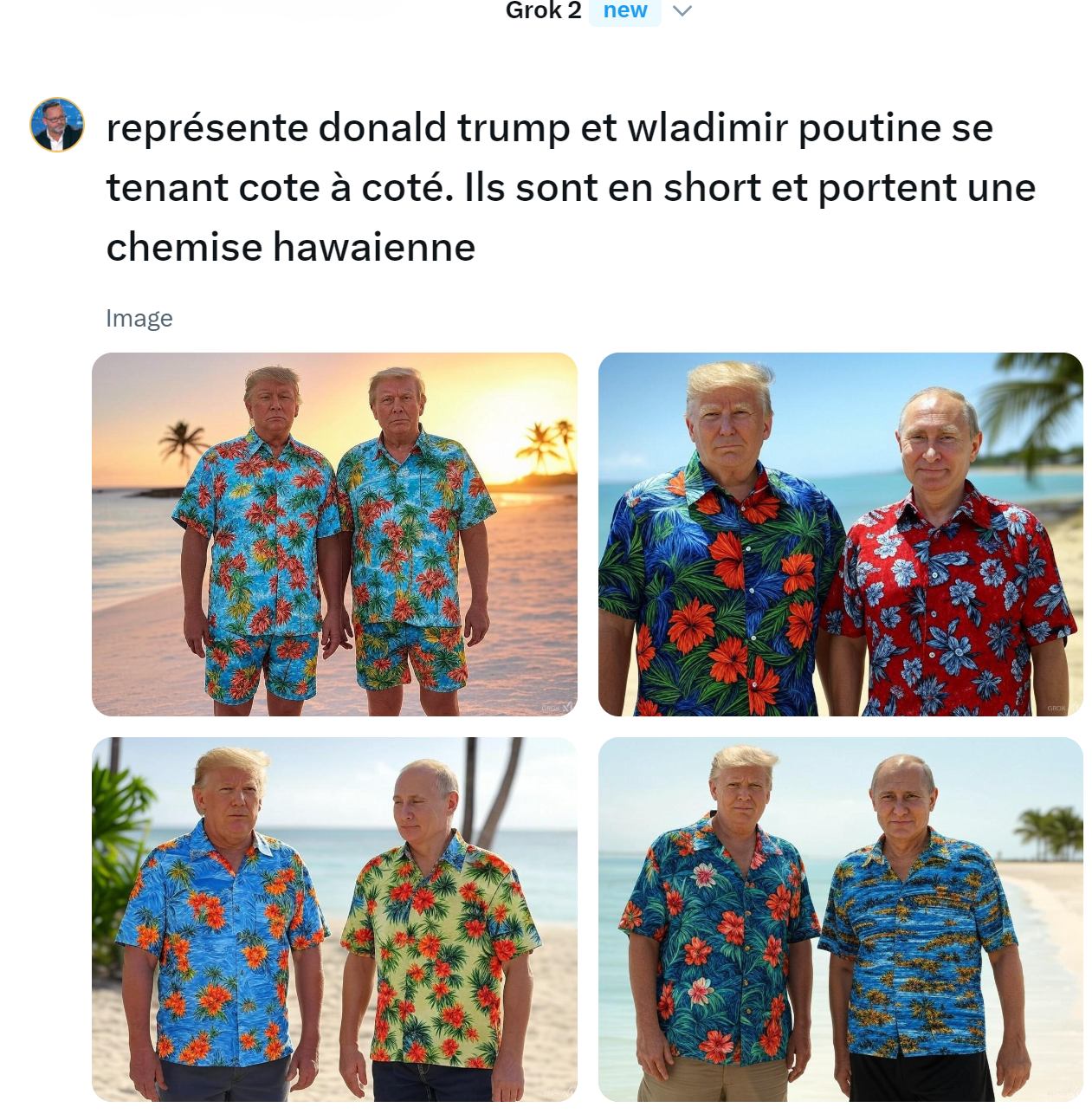 Demandez à Grok de « représenter Donald Trump et Wladimir Poutine se tenant cote à cote. Ils sont en short et portent une chemise hawaienne », vous pourrez faire croire qu’ils passent des vacances ensemble.