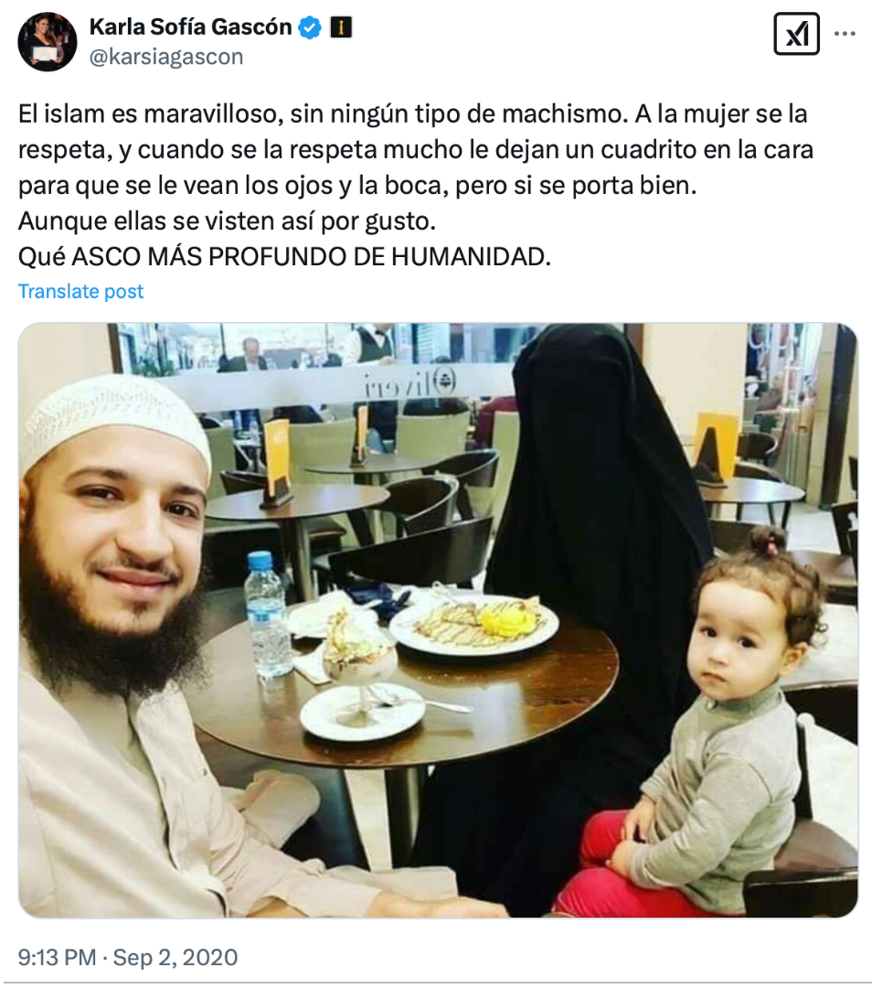 Il s’agit d’un tweet publié par Karla Sofía Gascón le 2 septembre 2020. Le message, rédigé en espagnol, exprime une critique ironique et sarcastique sur le traitement des femmes dans certaines interprétations de l’islam, notamment en ce qui concerne le port du voile intégral. L’image attachée montre un homme barbu souriant, portant une coiffe islamique, assis à une table de café ou de restaurant avec une femme entièrement voilée en noir, dont seul un petit carré laisse apparaître ses yeux et sa bouche. Une petite fille, probablement leur enfant, est également présente, vêtue d’un pull gris et d’un pantalon rouge, regardant directement la caméra. Le ton du tweet est clairement critique, et les propos de l’autrice expriment une indignation face à ce qu’elle perçoit comme une oppression des femmes.