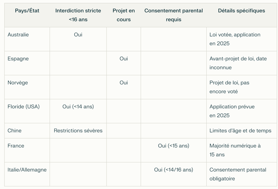 - Les tentatives de légistatives dans le Monde pour limiter l’accès aux réseaux aux plus jeunes