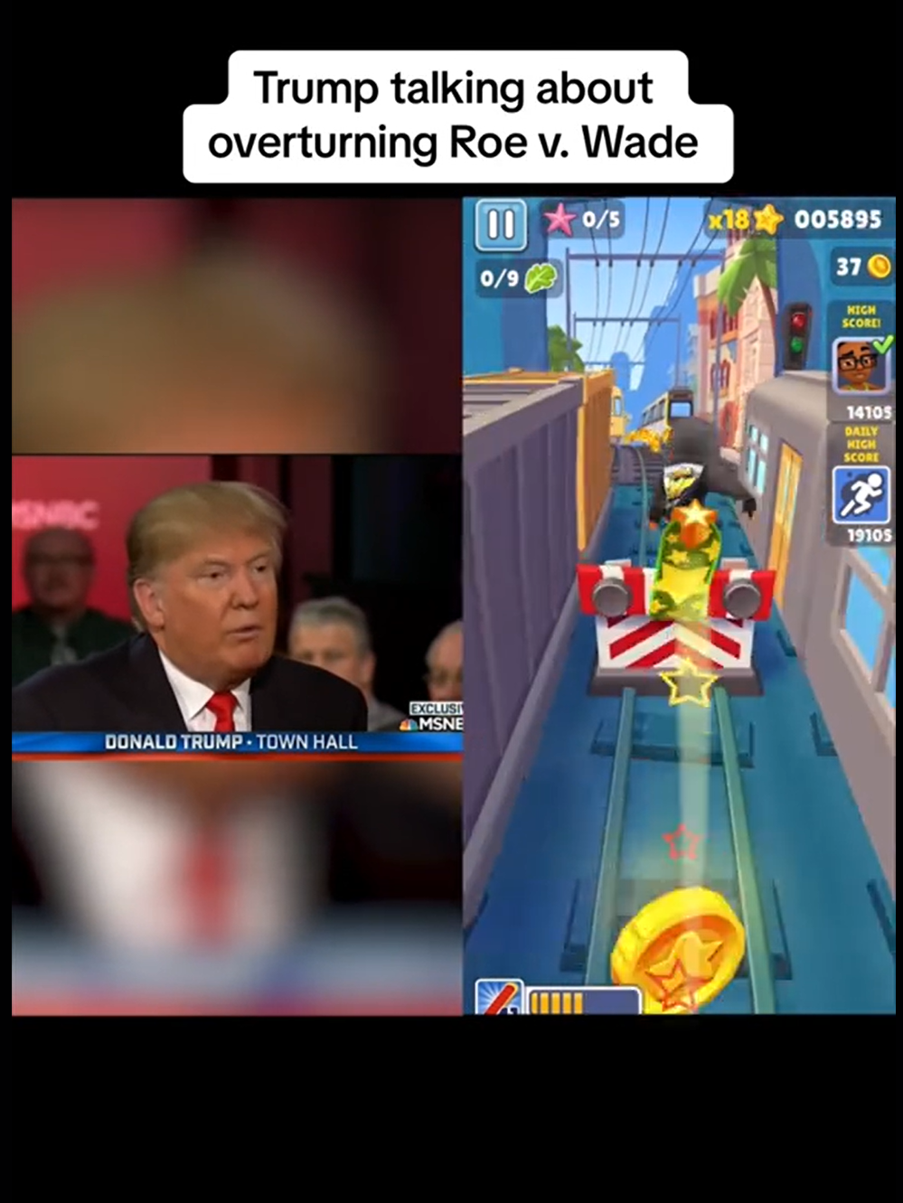 Dans un autre registre, Kamala Harris, candidate démocrate à la présidentielle, a adopté cette méthode sur TikTok. Par exemple, une vidéo publiée le 4 septembre 2024 montrait à gauche un extrait de Donald Trump évoquant son opposition à l’avortement, tandis qu’à droite, un jeu vidéo du type « runner » défilait en continu. Cette juxtaposition vise à retenir l’attention sur la partie droite de l’écran pour mieux faire passer le message politique à gauche.
