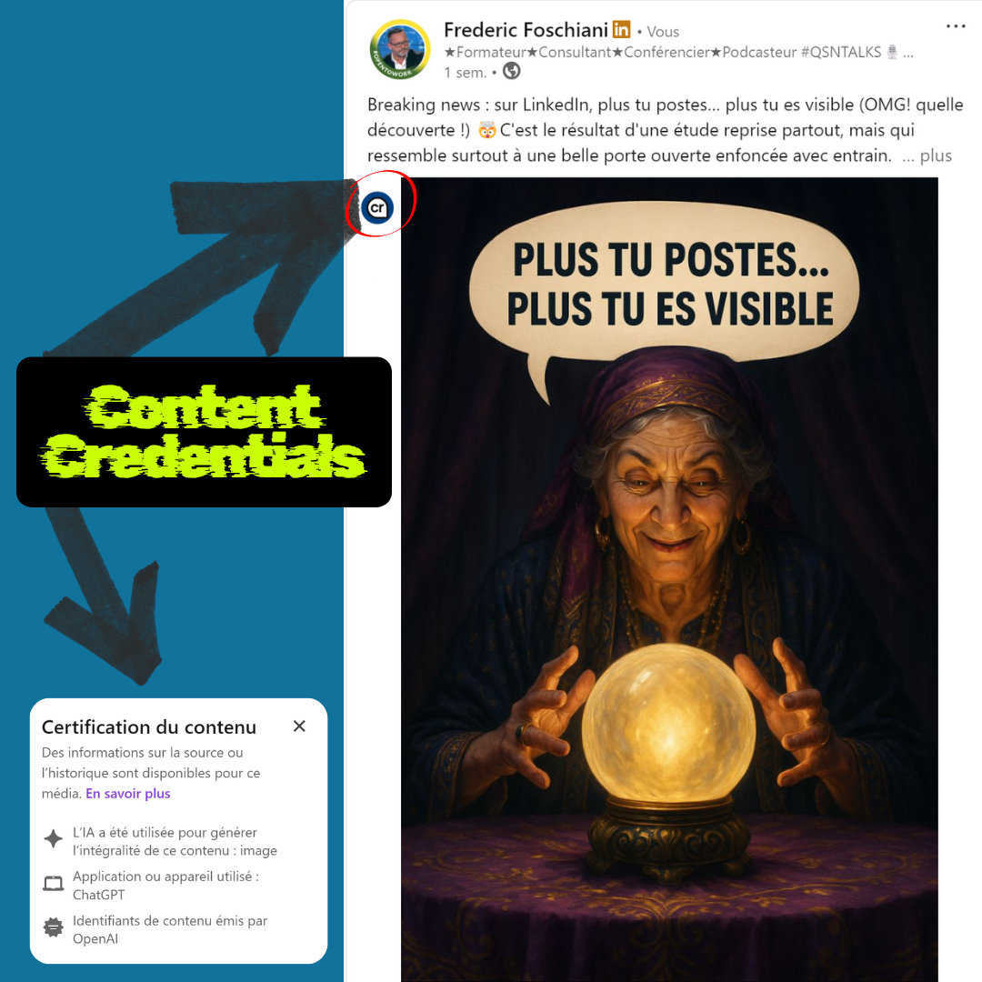 Il faut toutefois reconnaitre à LinkedIn une initiative intéressante et en avance sur les autres plateformes. Depuis Mai 2025, LinkedIn a franchi une étape majeure en devenant la première grande plateforme à adopter le standard C2PA (« Content Credentials »). Cette innovation vise à renforcer la confiance et à lutter contre la désinformation visuelle, en cohérence avec les obligations du DSA (Digital Services Act) et de l’AI Act.