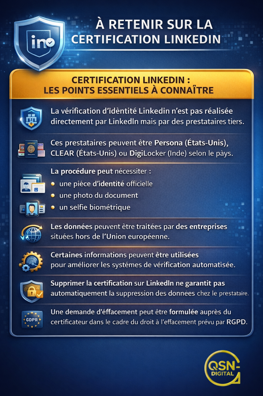 Cet article est la retranscription enrichie d’infographies, FAQ et ressources de l’épisode du podcast #QSNTALKS – Episode 92, Certification LinkedIn : faut-il vérifier son identité au prix de ses données personnelles ?, diffusé le 11 mars 2026.